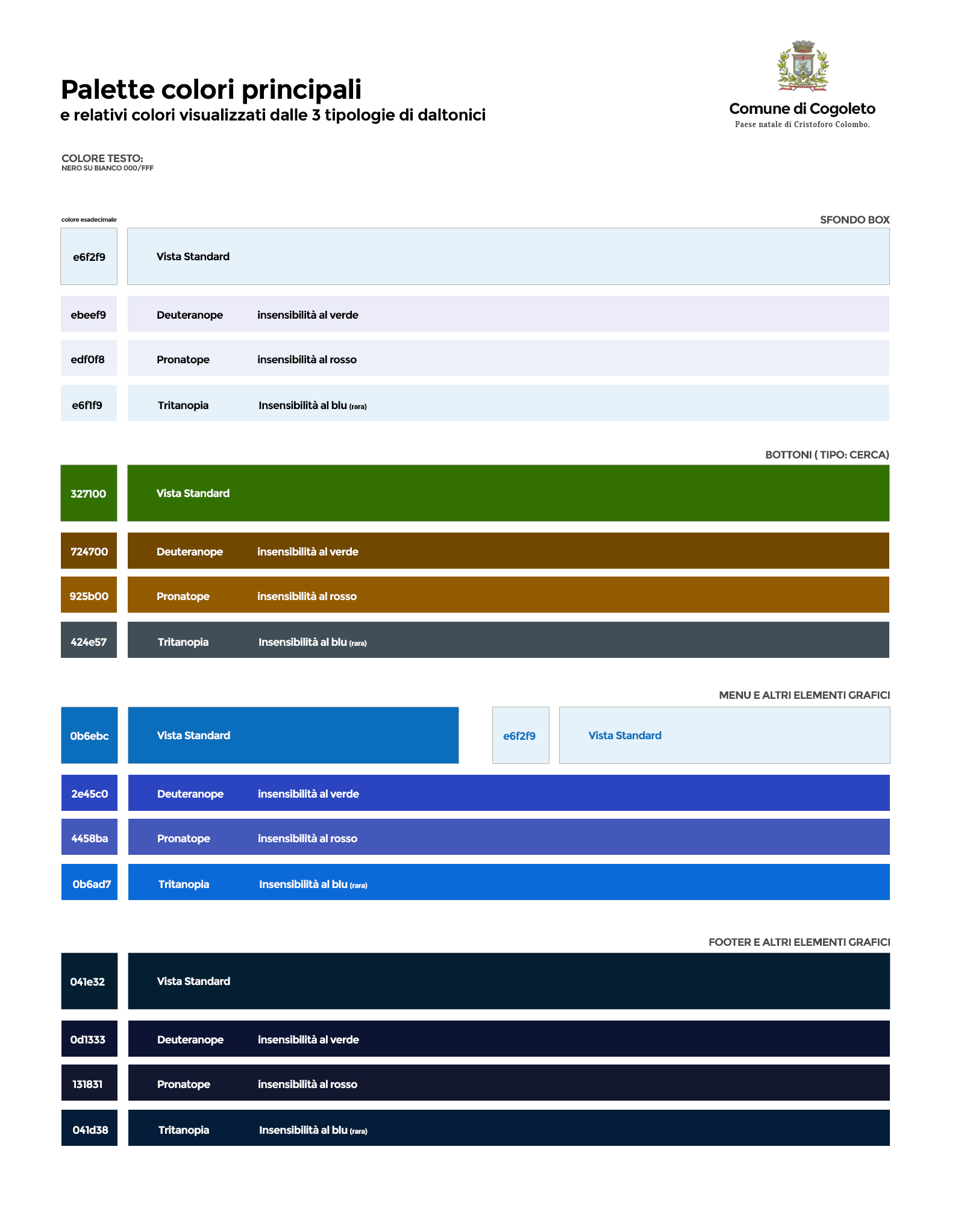 A fondo pagina la palette colori, studiata per il Comune di Cogoleto, evidenzia come rimanere sui colori blu sia la scelta ottimale per tutti i tipo di ipovedenti.